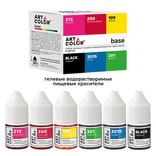 Набор пищевых гелевых красителей Art Color Base содержит 6 цветов: розовый, красный бархат, желтый, зеленый, синий, черный. Каждый краситель расфасован в удобный флакон 12мл с мерным носиком.