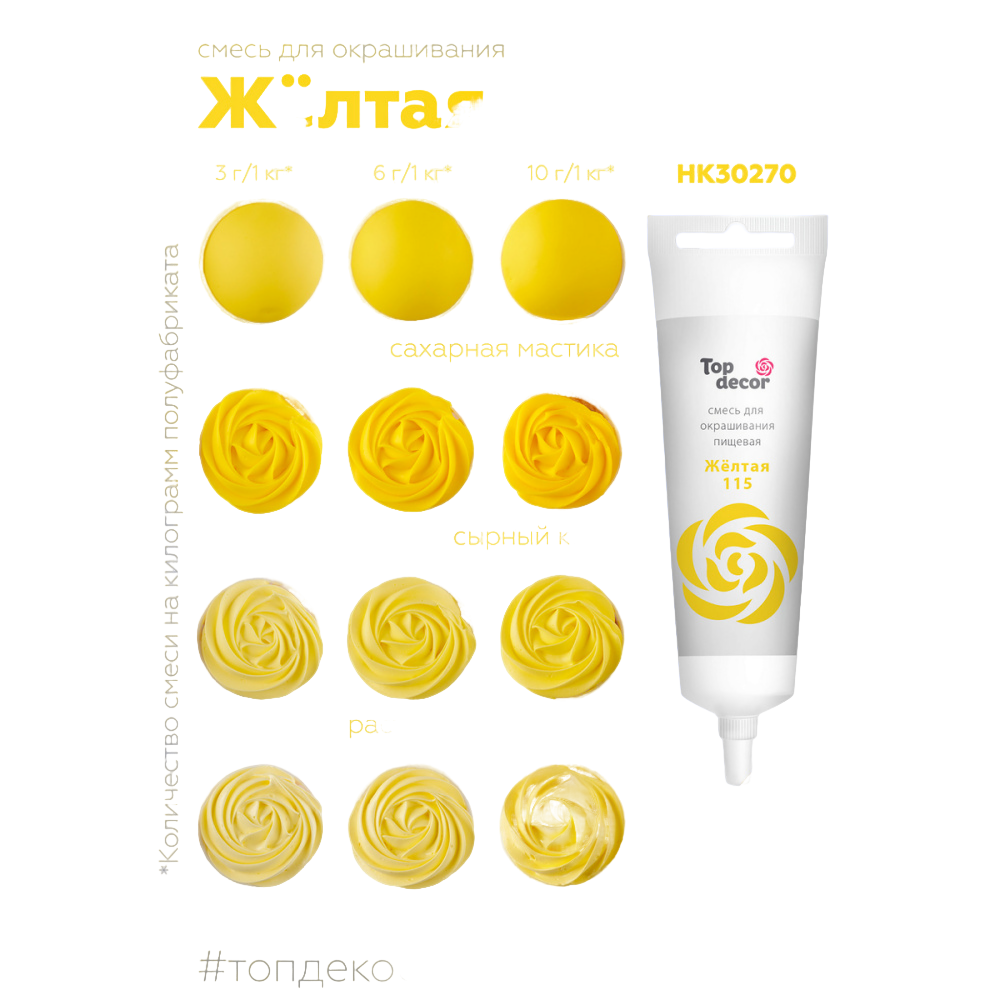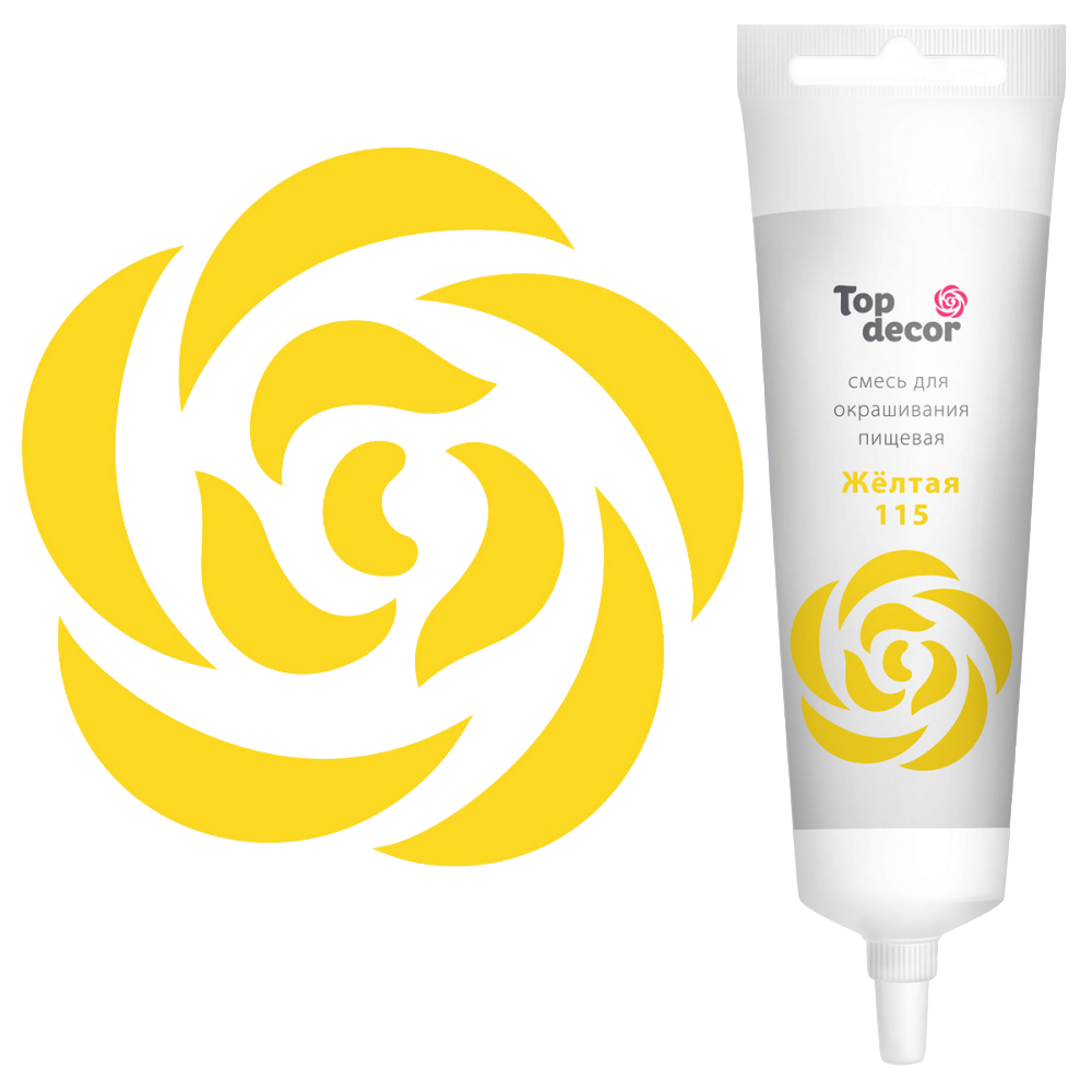 Краситель водорастворимый с высокой концентрацией красящего пигмента. Густая консистенция позволяет ему хорошо окрашивать по всей массе основные кондитерские полуфабрикаты (желе, мусс, крем, тесто, мастика и другие), не изменяя их консистенцию. Не имеет вкуса и аромата, благодаря чему сохраняет первоначальные вкусовые свойства окрашиваемого продукта. Рекомендуемая дозировка: 2-3 капли (0,1-0,15 г) на 100 грамм окрашиваемой массы. Продаётся в тюбике по 100 грамм. Способ применения: перед применением проколите пломбу тюбика, срезать не рекомендуется.