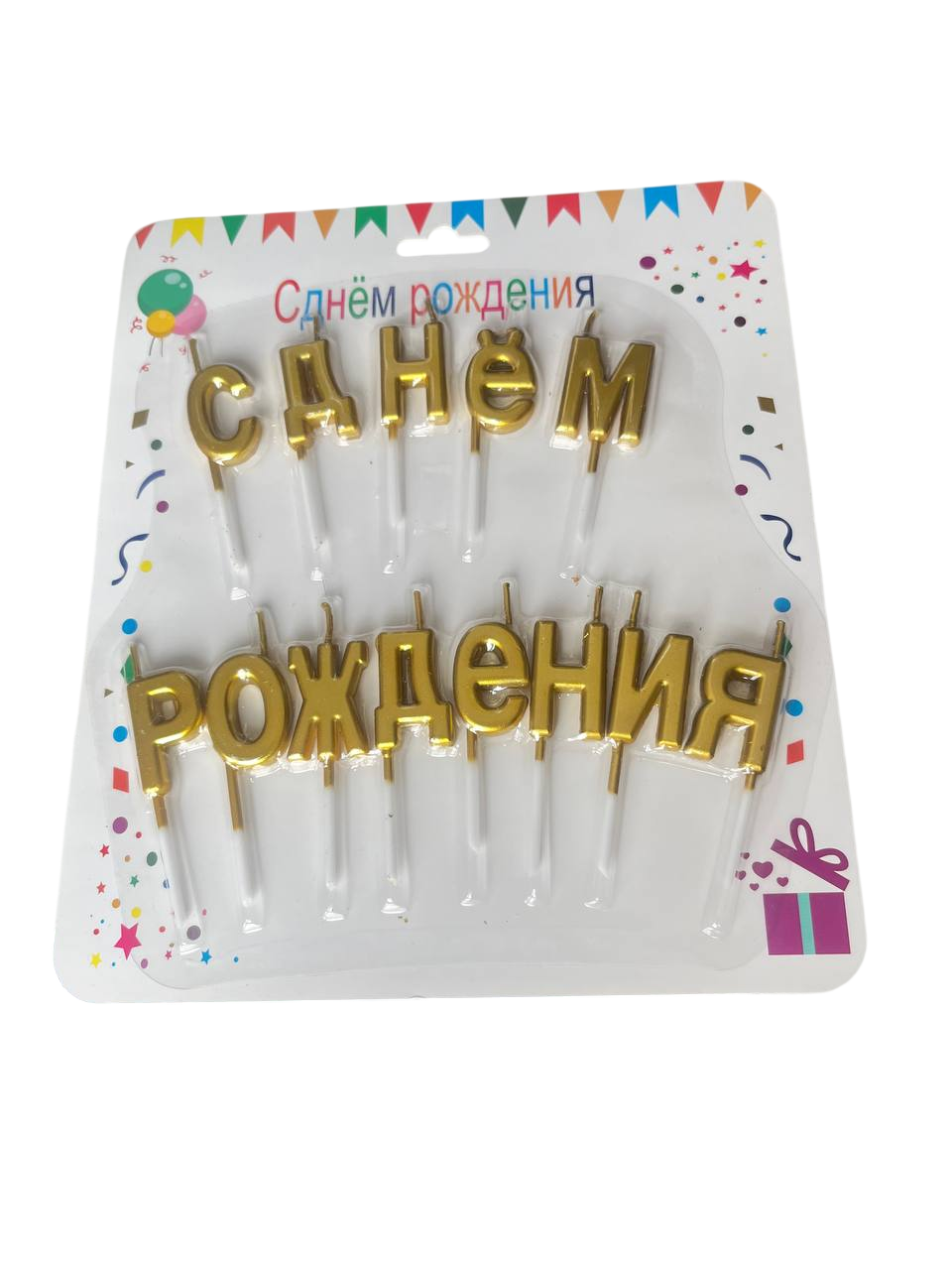 Набор состоит из 13 отдельных свечей, которые складываются в фразу «С ДНЕМ РОЖДЕНИЯ».